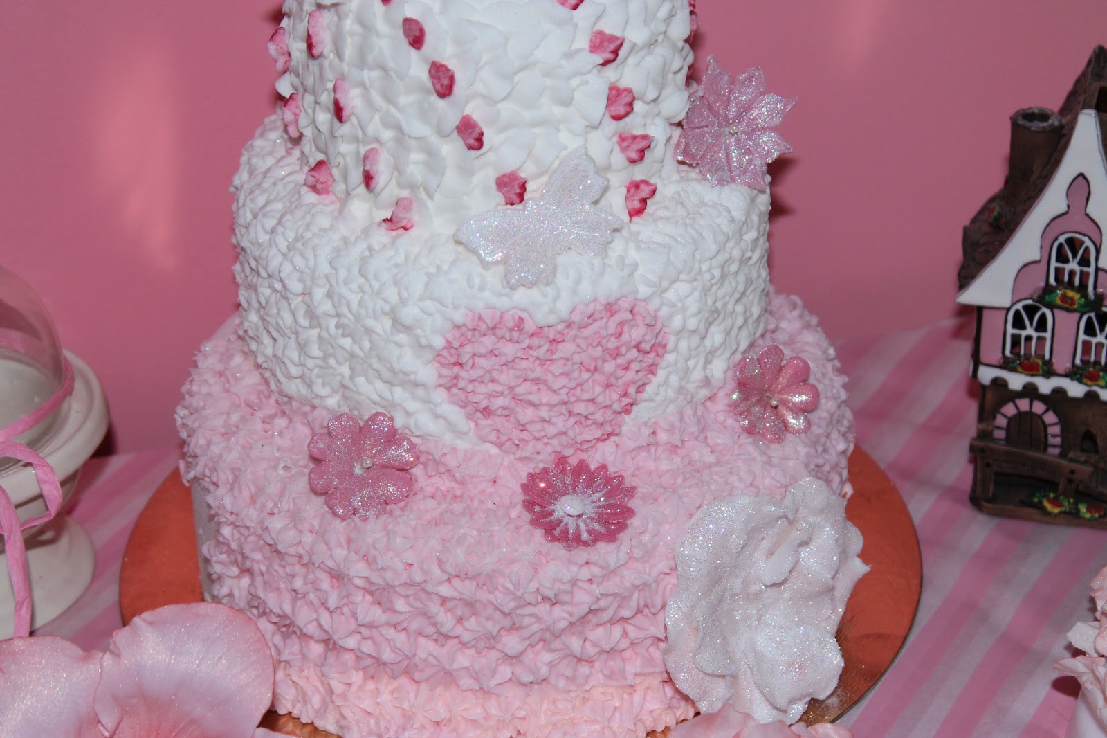 Es una pena que en la foto no se vea bien el rosetón de esta tarta. Porque es precioso.... sus pétalos son casi transparentes. En esta foto podeís ver las flores sin cortador. Menos la margarita, las demás están hechas a mano....